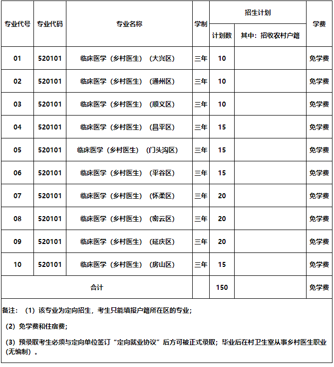 (5) 学生就业:学生依据就读前和区卫健委所签协议由各相关区卫健委统筹安排,毕业后在村卫生室从事乡村医生工作,服务期以协议签署年限为准。